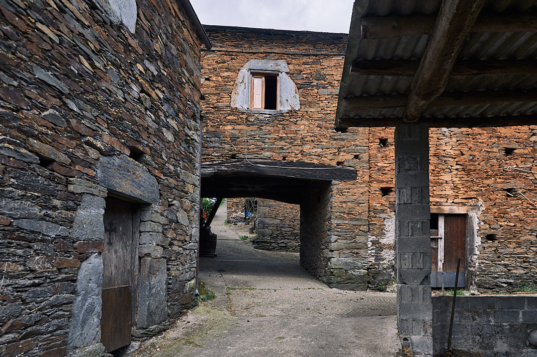 Sobrias edificaciones de piedra se apoyan en el roquedo natural y en algunos casos sobre el propio muro del camino, dejando túneles en el medio para el paso de personas y ganado, configurando así un arracimado complejo de paisajes subterráneos bajo las propias casas, que se denominan veiriles (túneles de las callejas).