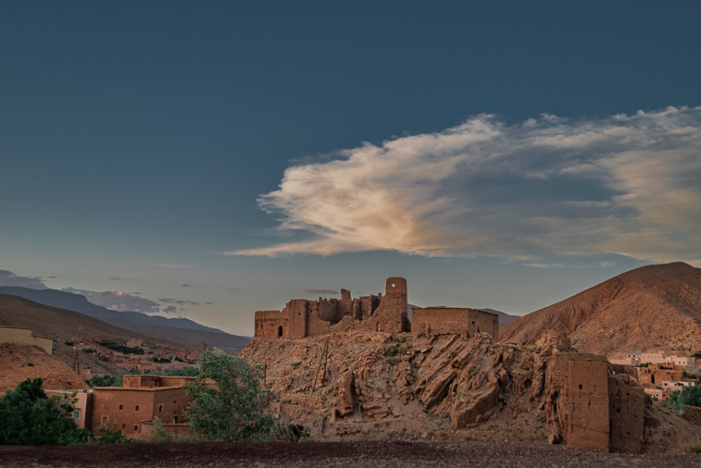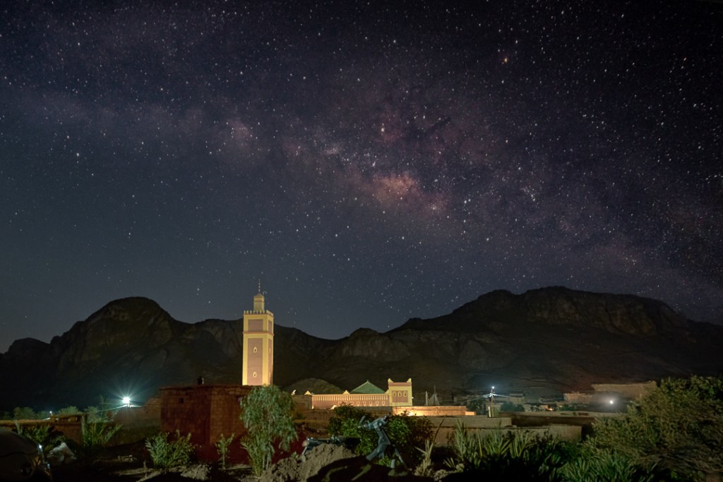 Alquilado un coche, el día 3 abandona la ciudad rumbo al Oasis de Fint, un palmeral escondido —n’fint significa “oculta” en bereber— a 10 km al sur de Ouarzazate, habitado por nómadas venidos de Mali que ahora cultivan dátiles en casas de pisé junto al wadi. La Auberge Restaurant TISSILI recibe con cena típica —tajín humeante, pan recién horneado— mientras un gato nos observa esperando algún trozo de carne, y la noche estalla en estrellas: el cielo sin contaminación obliga a girar la cabeza lento, capturando la Vía Láctea mientras el fresco del desierto aclara el aire. El silencio aquí pesa, roto solo por el rumor del agua y un perro lejano.