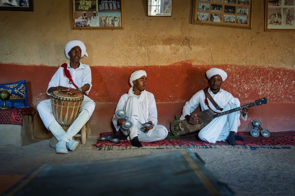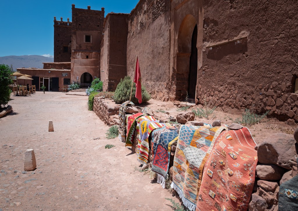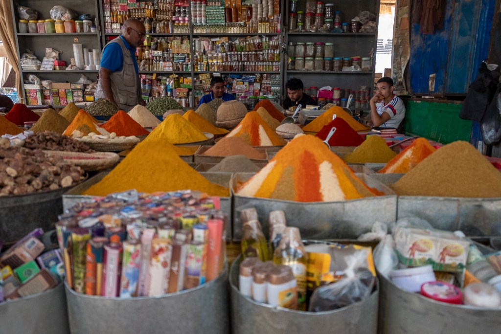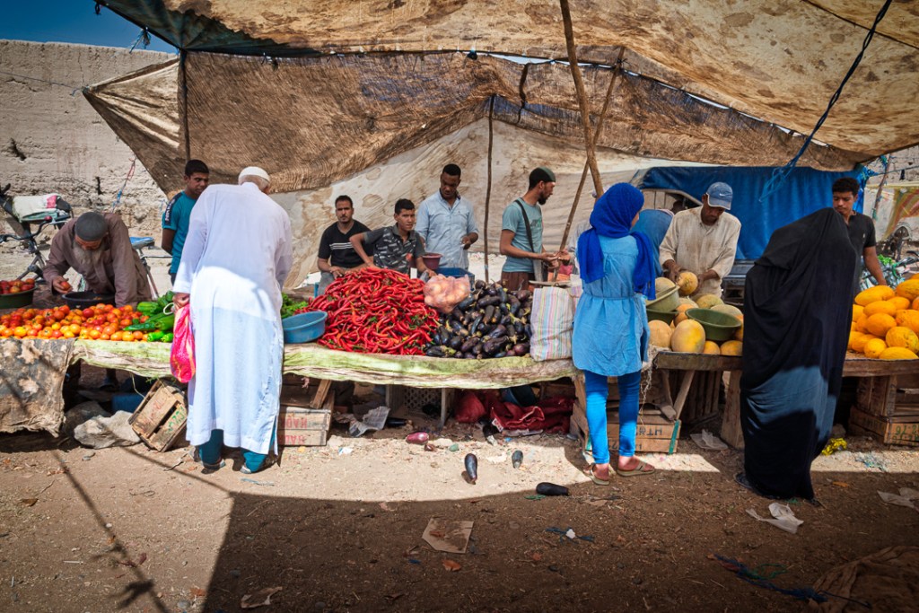Uno de los días os desviamos al mercado de Rissani, el más cercano y auténtico al desierto, un caos bereber de especias apiladas, frutas maduras, verduras polvorientas, ropa colgada en tenderetes y animales que balan entre puestos —especialmente vivo ese día, con el gentío local empujando carritos y regateando en tamazight—. Nos pareció lo más genuino de Marruecos, lejos del pulido turístico, con el aire cargado de polvo y vida cotidiana; al día siguiente, la fiesta del Cordero lo animaba aún más, con familias cargando reses y el olor a carne asada flotando sobre el bullicio. Visitas a lo típico —gnawa bailando ritmos ancestrales, un campamento nómada con alfombras raídas— alternan con tiempos muertos: arena en los dientes, sudor que seca rápido, silencios donde el viento modela crestas.