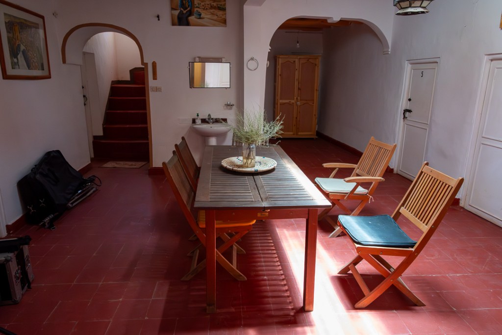 La ruta sigue a la Garganta de Dades, serpenteando por valles donde kasbahs erosionadas miran cañones de roca roja; el coche impone curvas que marean, con el sol calentando el salpicadero. Monkey Fingers House by Fatima Mellal, en Tamlalt, emerge como el alojamiento que cala hondo: Fátima, pintora local, abre la puerta con té de menta y muestra lienzos vibrantes de paisajes bereberes, paredes llenas de color que contrastan con el árido exterior. Al desayuno siguiente, el equipo de un reportaje televisivo marroquí rodea la mesa, compartiendo migas mientras Fátima habla de su arte; el cuerpo agradece la pausa, con vistas a la garganta que imponen quietud.