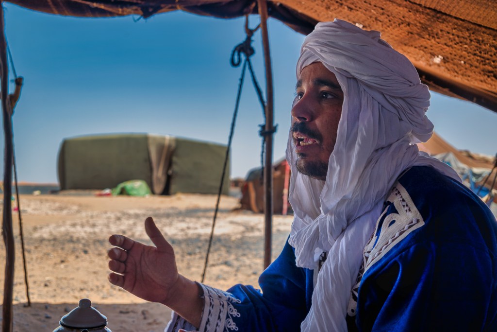 Entrando en el desierto, el Krich Camp en Merzouga, marca cuatro noches inmersivas: Hassan recibe con hospitalidad bereber, Mohamed nos lleva en 4×4 por las dunas de Erg Chebbi, subiendo arenas que queman al mediodía y se tiñen de oro al ocaso.