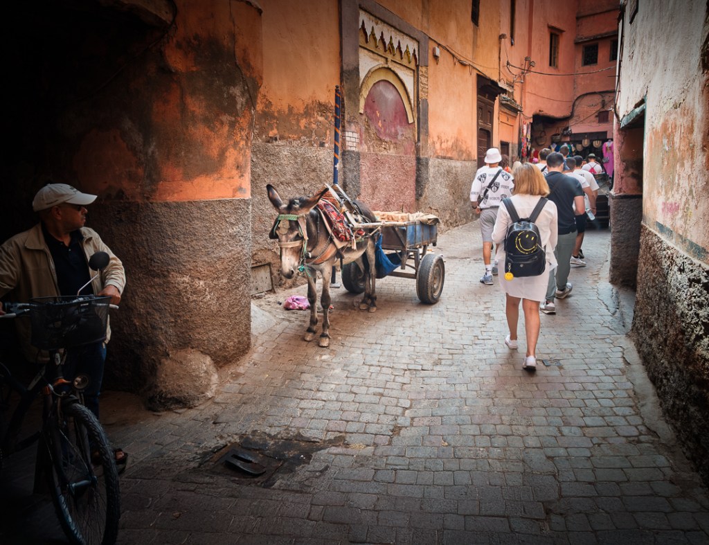 La llegada a Marrakech descarga directo en la plaza Jemaa el-Fna, donde un hombre sin mediar palabra agarra las maletas y las carga en un carrito de dos ruedas, zigzagueando casi a la carrera entre domadores de serpientes, carros de naranjas y el humo de cuscús que sube desde braseros. El trayecto impone el primer vértigo: motos que esquivan peatones, olores que chocan —menta, cuero, especias—, hasta que el Riad Bamileke emerge en la medina como un patio sombreado con textiles africanos y arte que contrasta con el bullicio exterior. La noche allí, con dos estancias por delante, trae el primer adhan de un muecín lejano y el cansancio que pesa en las piernas tras horas de vuelo y plaza.