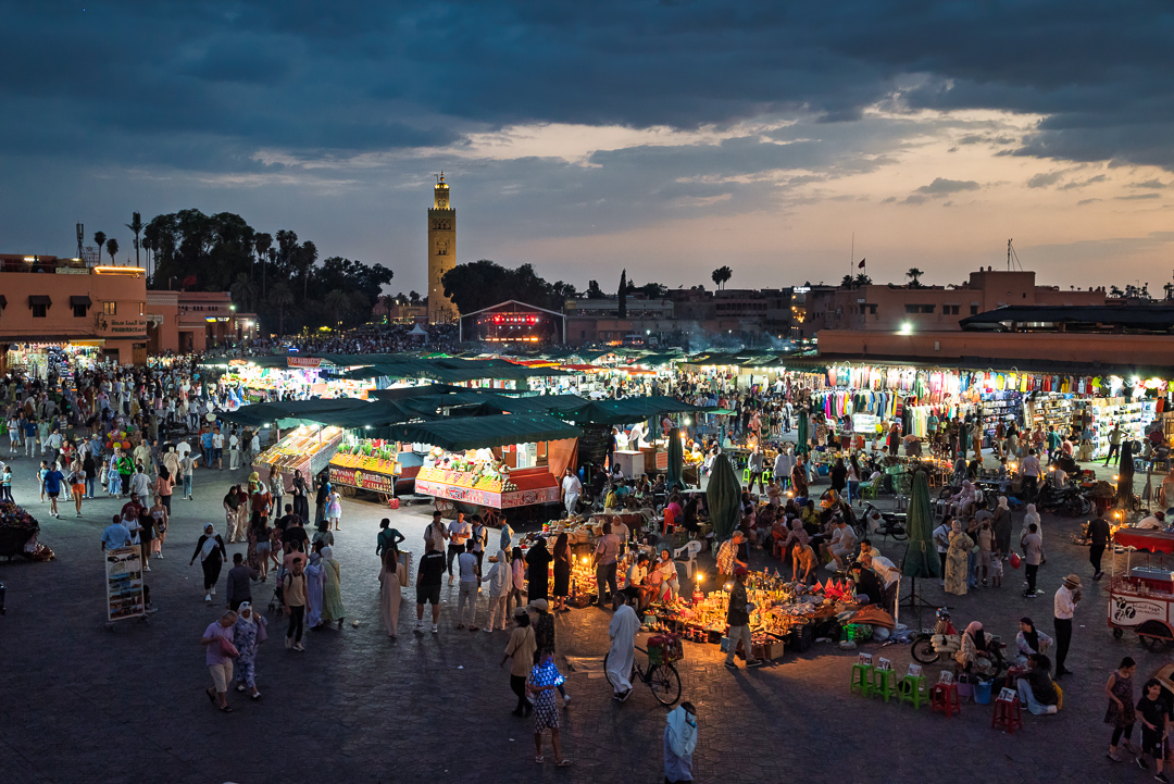 La llegada a Marrakech descarga directo en la plaza Jemaa el-Fna, donde un hombre sin mediar palabra agarra las maletas y las carga en un carrito de dos ruedas, zigzagueando casi a la carrera entre domadores de serpientes, carros de naranjas y el humo de cuscús que sube desde braseros. El trayecto impone el primer vértigo: motos que esquivan peatones, olores que chocan —menta, cuero, especias—, hasta que el Riad Bamileke emerge en la medina como un patio sombreado con textiles africanos y arte que contrasta con el bullicio exterior. La noche allí, con dos estancias por delante, trae el primer adhan de un muecín lejano y el cansancio que pesa en las piernas tras horas de vuelo y plaza.