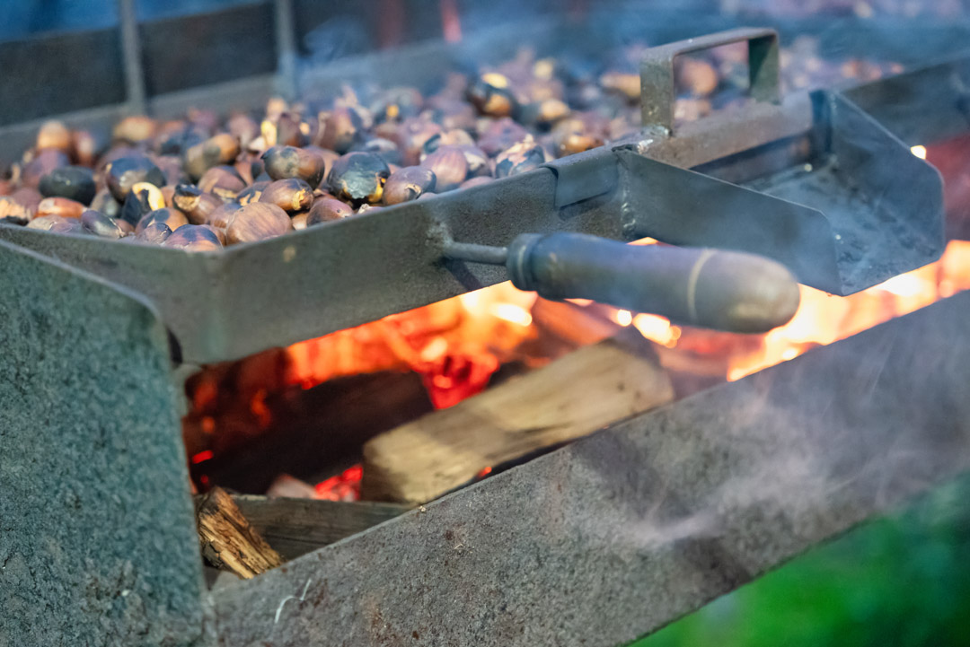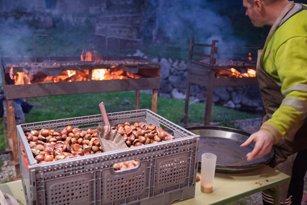 La fiesta comenzó a las 16:30h con el tradicional asado de castañas, un ritual que marca el inicio del otoño en los Valles de Buelna. El aroma de las castañas asadas inundó la pista cubierta de Coo, mientras la Banda de Gaitas L’Abrigu animaba el reparto y ponía el ambiente perfecto para la cita. El público, con ganas de fiesta, compartió este manjar típico acompañado de los platos más propios de la zona, como las “Carboneras”, especialidad local a base de castañas.